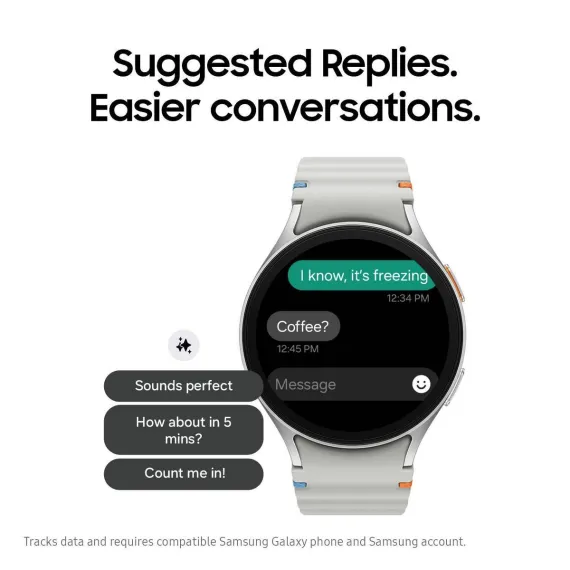 "Your favorite new health and wellness companion is here — Galaxy Watch7. Enhanced with Galaxy AI,1 this Watch has everything you need to keep you moving toward your health goals. Wake up on the right side of the bed every morning with an Energy Score1 that helps you understand your well-being better. Hit your morning workout while staying in touch with your world — make calls from your Watch and quickly respond to texts on the go with Suggested Replies.2 Then hone in on your heart health during your workout with improved Heart Rate Tracking,3 and improve each day with personalized Wellness Tips4 viewable right on your Galaxy smartphone.5 Plus, stay in the zone by streaming your favorite playlist or podcast from your Watch to your Galaxy Buds.6