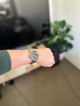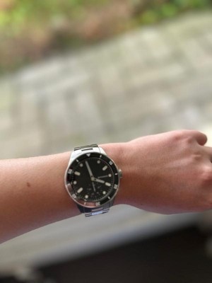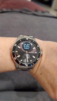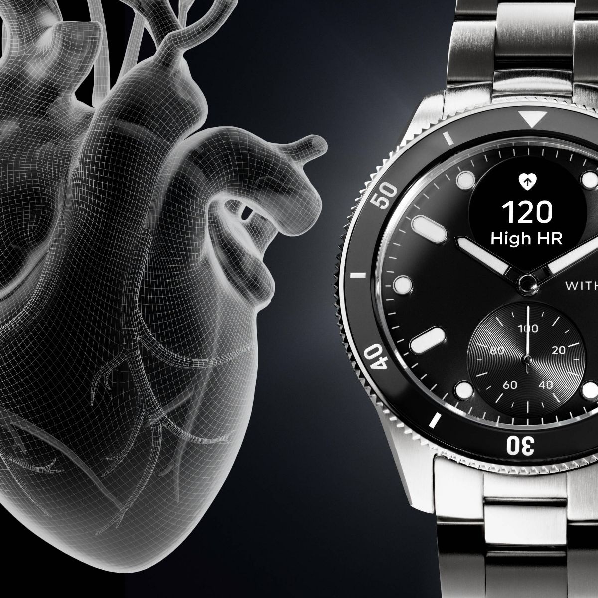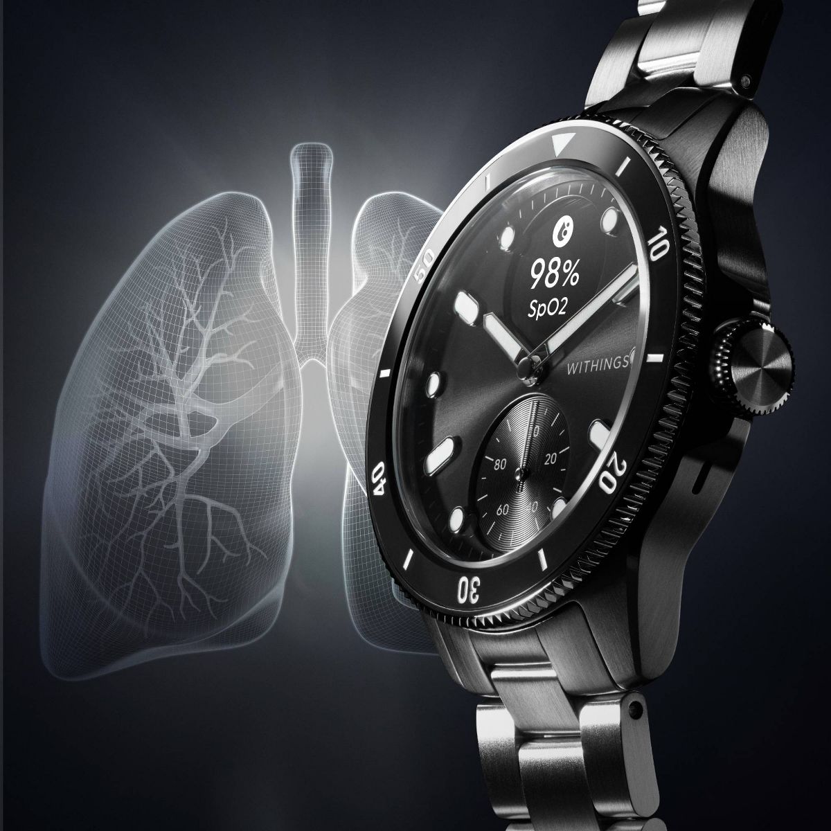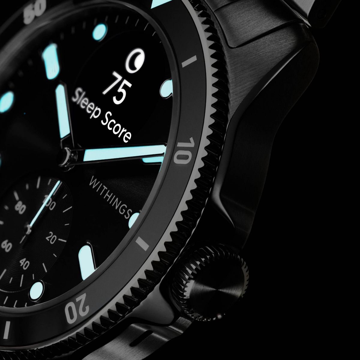 ScanWatch Nova is a 10 ATM watch with iconic diver style that features a unique sunray dial with Super-LumiNova indexes and hands, stainless steel casing with mirror-polished edges, and protective and anti-reflective sapphire glass. It includes a rotating ceramic and stainless steel bezel and an Oyster metal bracelet that tapers from 20 mm to 18 mm for a secure, comfortable fit.