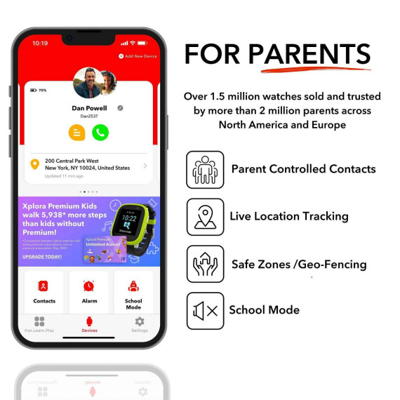 Playful, powerful and personal at the same time! Enjoy a faster processor, sharper screen, more storage, and an awesome camera on our new premium smart watch for kids - The X6Play. The X6Play, a phone worn on your child's wrist, allows for calls/messages/emoji, no internet access, no social media, GPS location tracking, safe zones, and school mode. All contacts must be parent-approved in the app. As with all Xplora watches, the X6Play connects parents with their kids via the free Xplora App—available from the Apple and Google Play stores. The X6Play is Xplora’s premium kids’ smart watch where families can stay in contact and kids can get rewarded for being active! Using our revolutionary rewards system, kids receive 1 Xplora Coin for every 1,000 steps they take. Xplora Coins are valid in the unique Xplora Kids' Activity Platform that features fun games, activities, and exciting campaigns. Kids can personalize their Xplora experience more than ever before, with multiple color combinations on straps and frames with the Xplora Switch, mix & match concept! Tons of cool stuff from the Kids' Activity Platform can be downloaded to customize each watch! It provides a fun and safe environment for young children from the age of 4 to 11 years while providing comfort, security, and peace of mind for the whole family. A SIM card is preinstalled in each watch. Connectivity is required with a monthly subscription charge from $9.99 to $13.99 per month.