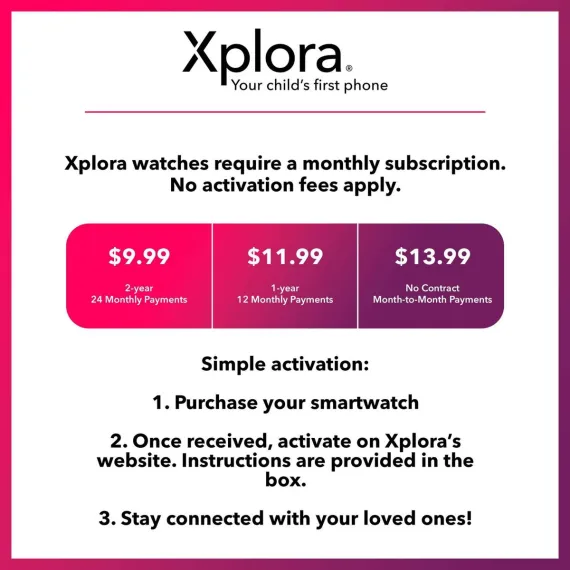 Meet the all-new XGO3 smart watch for kids with a phone and GPS. Packed with technology, the XGO3 includes all the features typical of a conventional cell phone but is designed as a smart watch with safety in mind—and simplified for kids. The XGO3 has all the high-quality features of a premium Xplora device at a more affordable price. Featuring a 2 Megapixel camera and a larger 850mAh battery, the XGO3 also comes with a SIM card so it can be up and running straight from the box. Including a step counter, the XGO3 encourages kids to keep active by rewarding their movement with Xplora Coins that can be redeemed in Xplora’s award-winning Kids' Activity Platform for fun games, activities and exciting campaigns. As with all Xplora watches, the XGO3 connects parents with their kids via the free Xplora App—available from the Apple and Google Play stores. The easy-to-use app allows parents to fully control all watch functions, including parental pre-approved contact list, GPS, safety zones, school mode and much more. The XGO3 from Xplora is the perfect introduction to the digital world for kids. It provides a fun and safe environment for young children from the age of 4 to 11 years while providing comfort, security, and peace of mind for the whole family. There is no social media or internet access. The XGO3 ships with an Xplora Connect SIM and requires a monthly subscription from $9.99 to $13.99 per month.